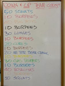 Stole idea from F3Lex pax (Ken Doll) for this gloom w/o. See photo. Lots of reps that decrease, yet spaced with 10 Burpees! Got to the bottom of the list with time remaining, so pax rotated with audible (and 10 burpees of course). EndEx!